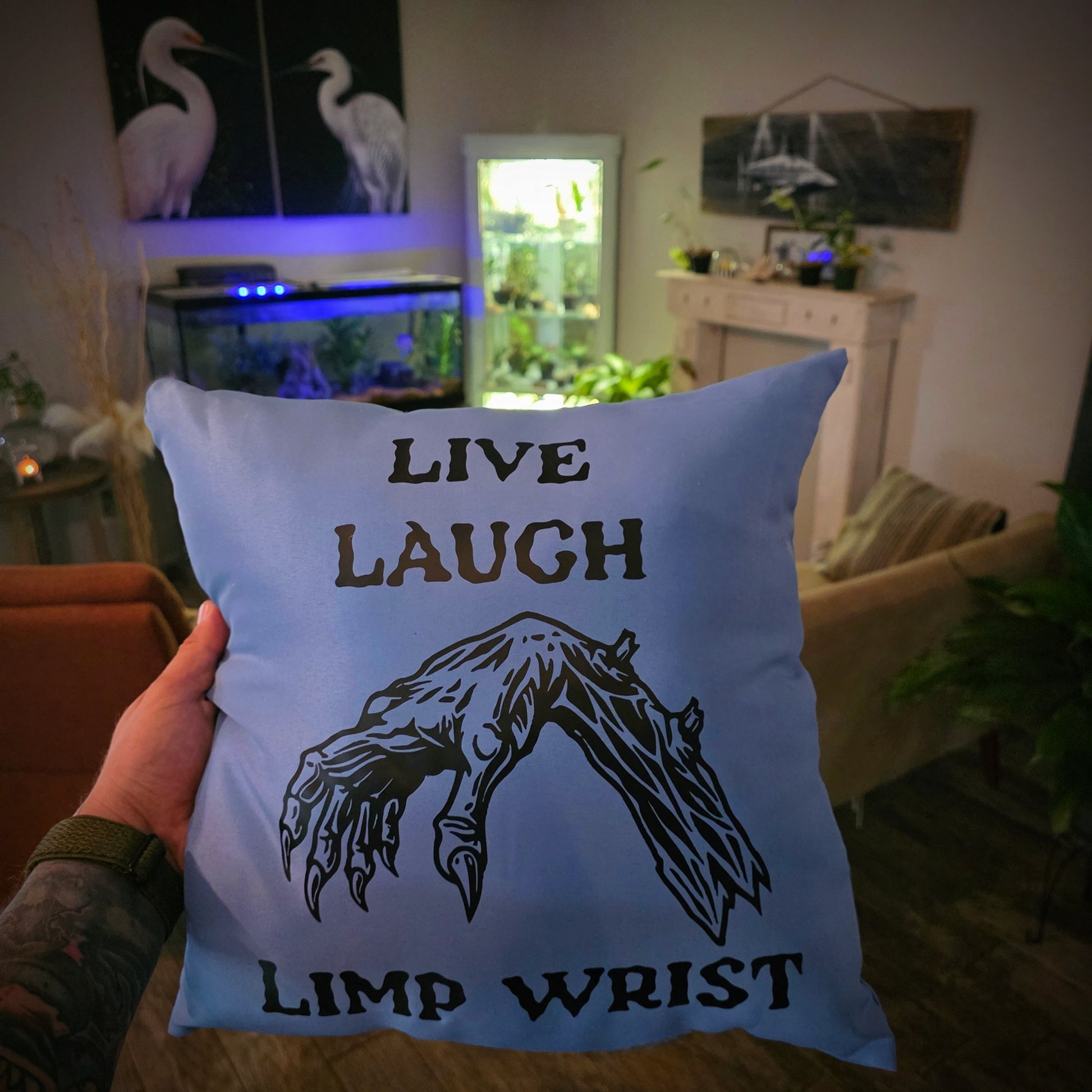 Finally, a home decor mantra you can actually get behind. This plush throw pillow features the iconic “Live Laugh Limp Wrist” design with a clawed, elegantly limp hand, the perfect accent for your haunted chaise or queer crypt. Cozy, cursed, and 100% camp.