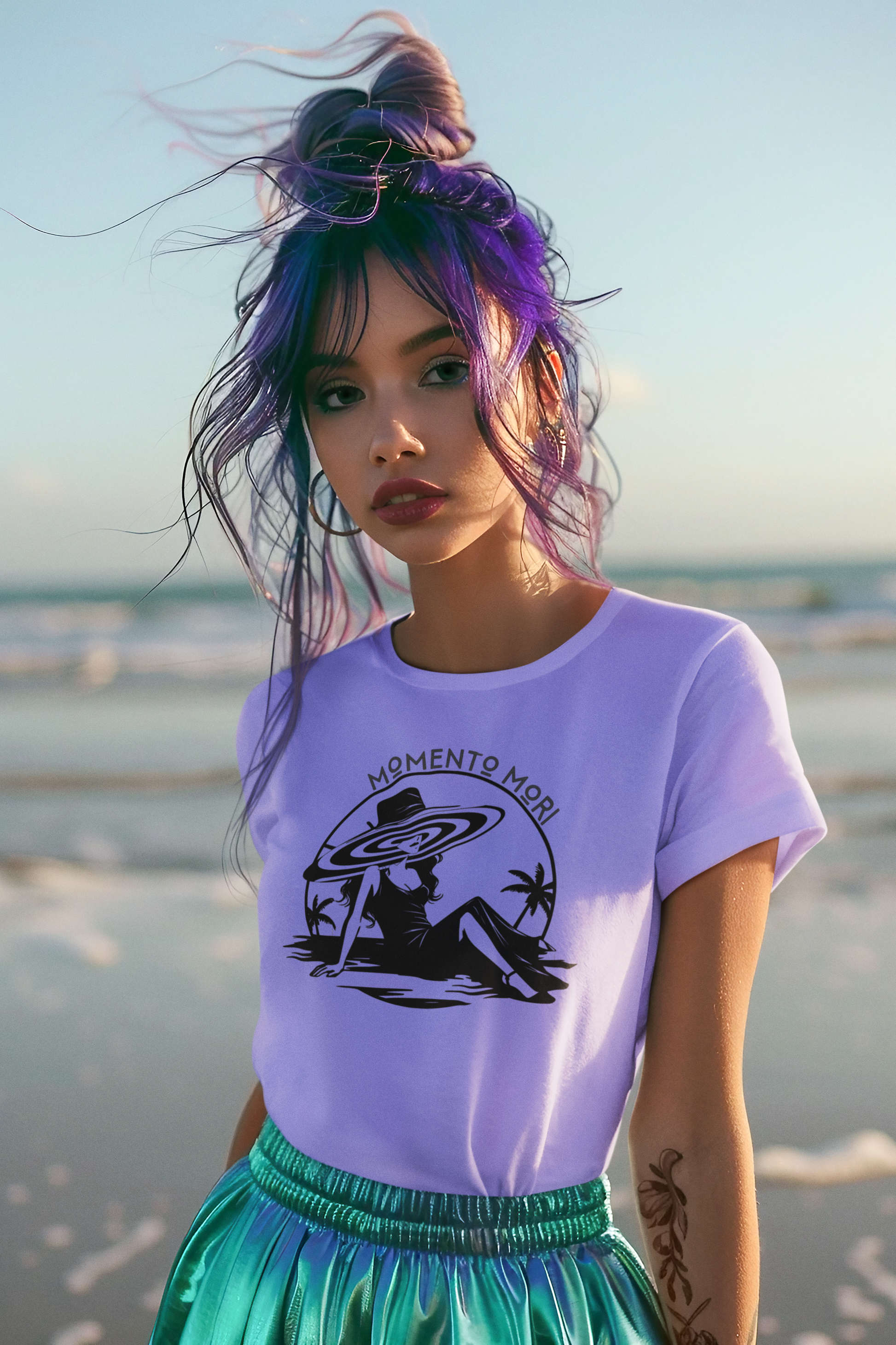 A divine reminder in pastel: you will die, so look hot doing it. Featuring a femme figure lounging in a sunhat like the glamorous ghost of your future, this tee blends vacation vibes with goth existentialism.