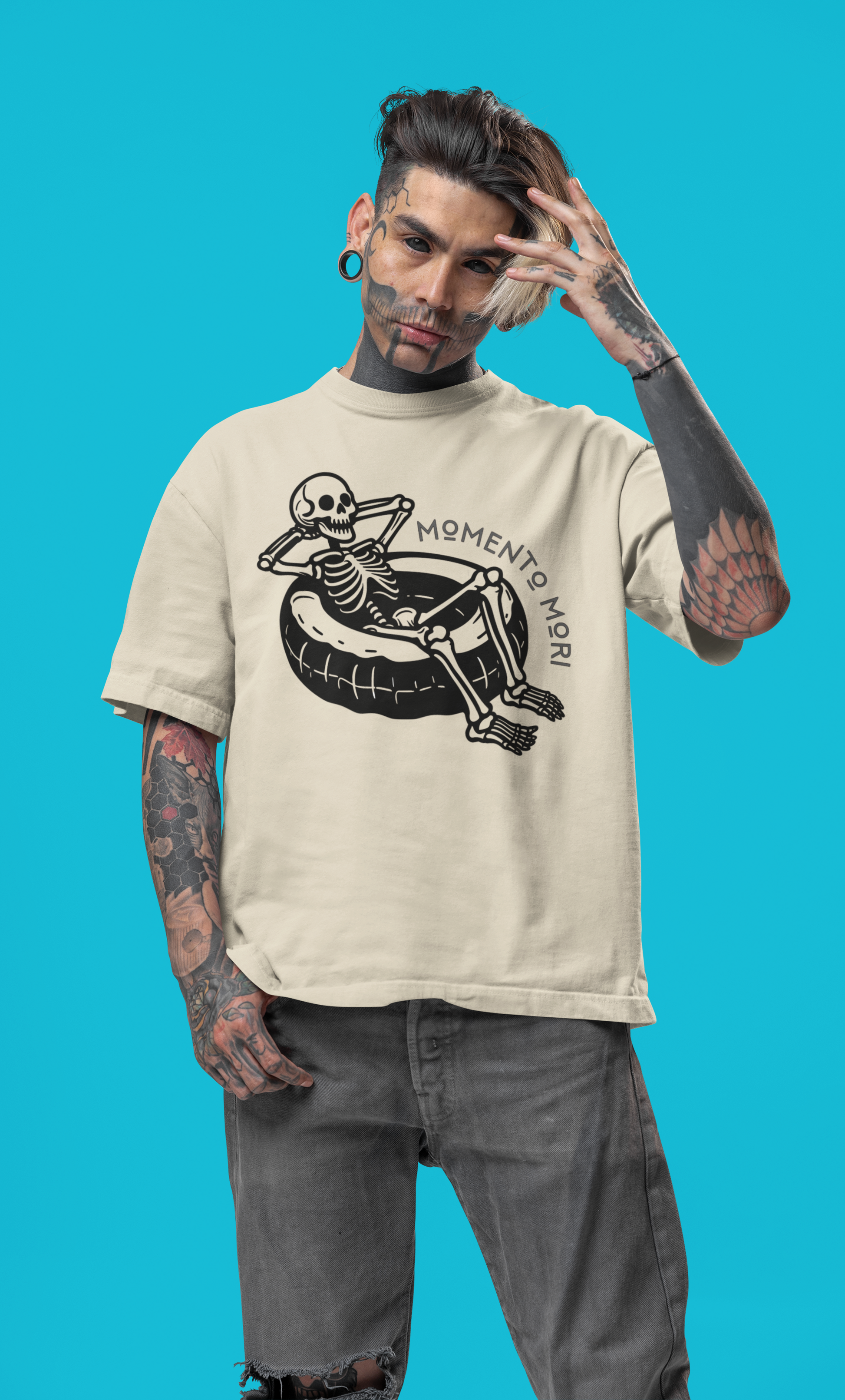 Death takes a day off. This relaxed-fit tee features a skeleton catching rays in a floatie, reminding you that even the grim reaper needs a break. Memento Mori, but make it SPF 100.
